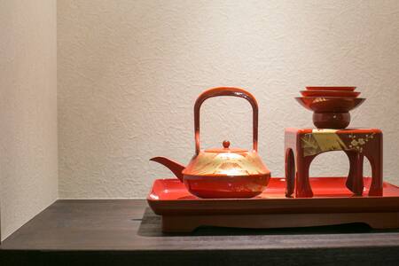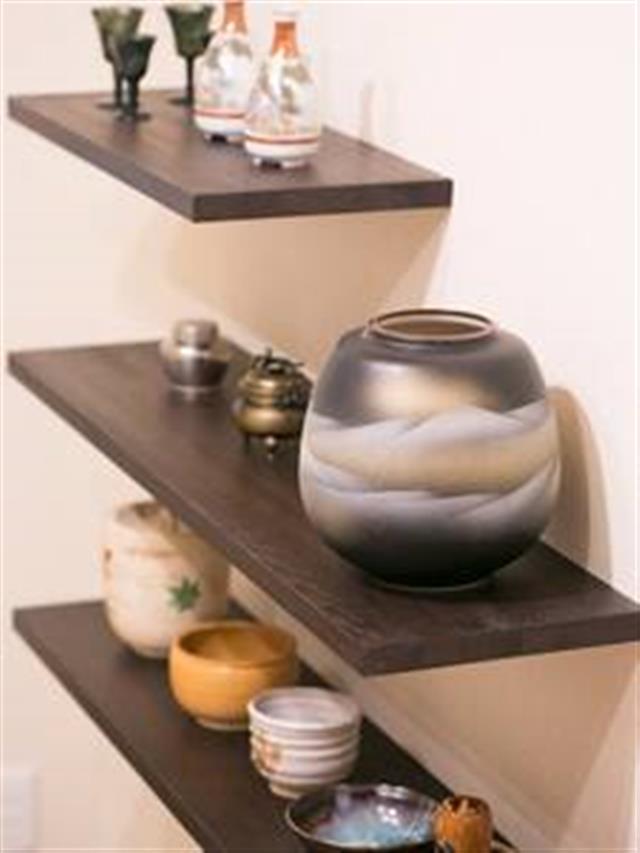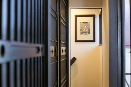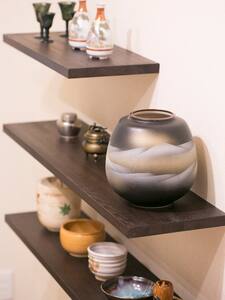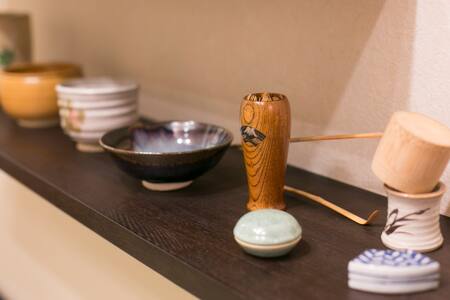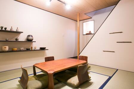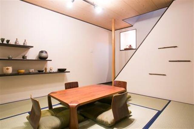 古い家屋を解体して、宿に改修しました。玄関脇に竹を植え、土間に民芸調の家具を誂えました。リビングの飾り棚には、ちょっとした茶道具も。京都らしさを感じていただければ嬉しいです。